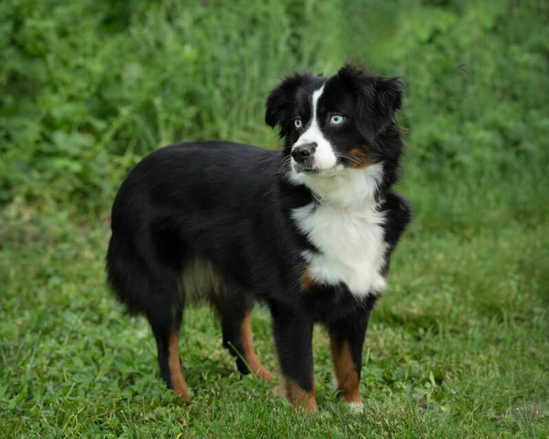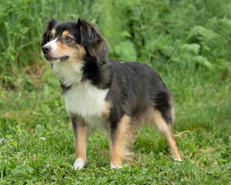 "Jasmine" Mini Aussie. 14 inches. Black Tri, BET. Clear panel. Registered ASDR